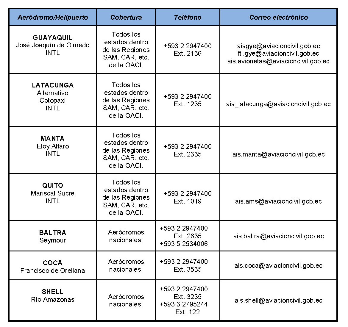 - Correo-e: ais_ecuador@aviacioncivil.gob.ec